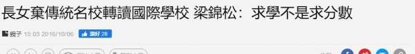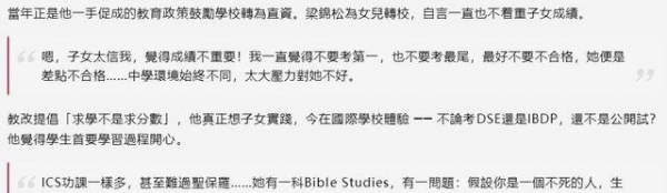 梁锦松和伏明霞大女司渝也曾在圣保罗男女中学读书,后来转到基督教国际学校了,原因也是女儿压力太大了,想换间学校让女儿知道求学不是求分数。