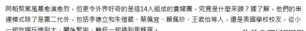像麻衣这样因为婚姻从明星变成名媛的还有李倩蓉,李倩蓉中学也在台北美国学校就读。"阿帕契"事件发生后,有台媒扒出包括李倩蓉在内的14人贵妇团,多是美国学校校友。