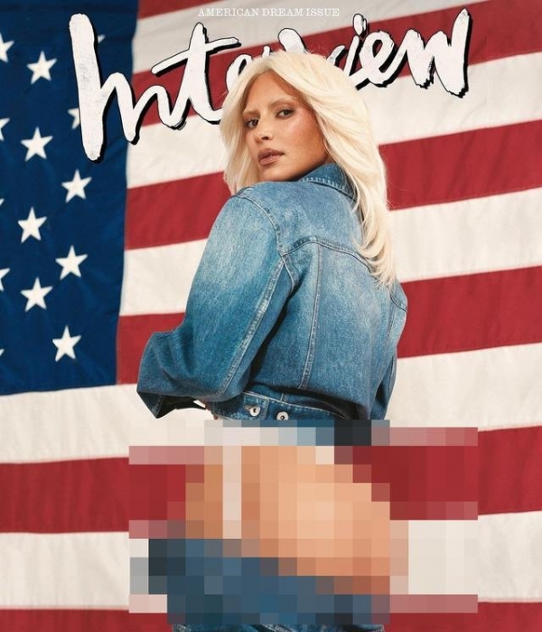 她的牛仔裤刻意没有拉上拉链,卡在臀部下方,