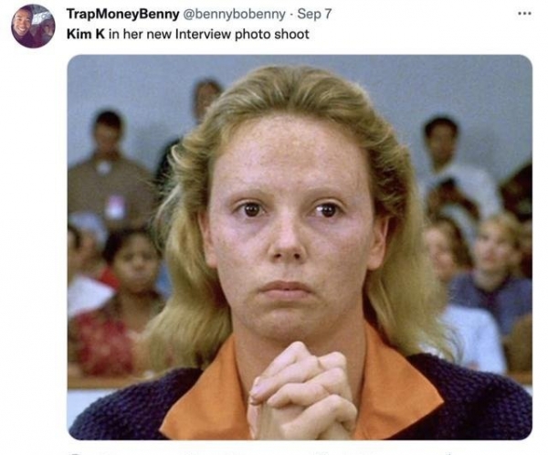 "新的采访照片里,金姐和她一模一样!(图为电影《女魔头》中的查理兹·塞隆)"