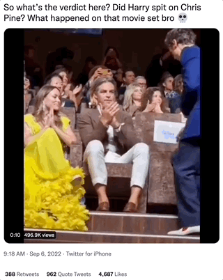 超尴尬的红毯结束后,众人挪步首映电影院,这次又是隔开坐。名场面再次出现,坐在导演和哈卷中间的克里斯·派恩,疑似被哈卷吐了口水,表情耐人寻味。