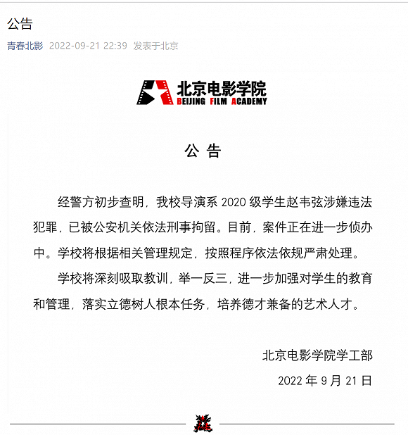 随后,北京电影学院学工部发布公告称,经警方初步查明,导演系2020级学生赵韦弦涉嫌违法犯罪,已被公安机关依法刑事拘留。目前,案件正在进一步侦办中。学校将根据相关管理规定,按照程序依法依规严肃处理。