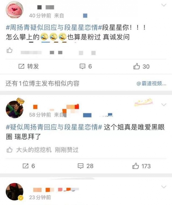 一些网友还说周扬青是唯爱黑眼圈,感觉她又找了一个"罗志祥",也有网友觉得段星星这波实属高攀了。