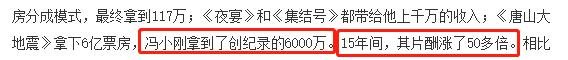 仔细算一算,从《甲方乙方》到《唐山大地震》,中间经历了15年,在这15年间,冯小刚的片酬从117万元变成了6000万元,足足涨了52倍之多。