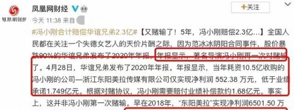 2021年,这份对赌协议到期,冯小刚没有完成曾经承诺的业绩,虽然对赌失败需要补齐的2.35亿元,但此次对赌依旧为他带来了8亿元的收入。