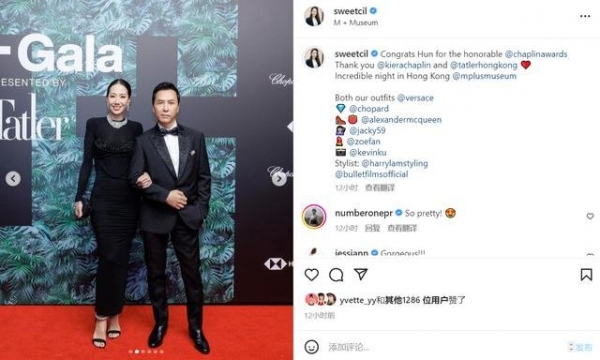 为了尊重场合,甄子丹夫妇盛装出席。汪诗诗穿着一身黑色金色晚礼服,头发挽起,她的手上、脖子、耳朵戴满钻石首饰,一身钻饰太耀眼。