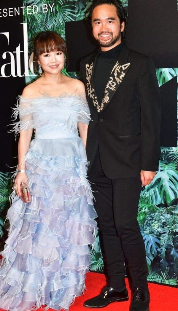 其他嘉宾也盛装参加派对,满脸胡子的郑志刚,穿着金色领西装,打扮十分吸睛。妻子余雅颎穿着蓝色搂肩晚礼服,看起来很是雍容华贵。