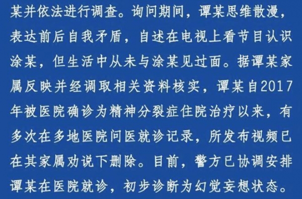 后来调查结果出炉,原来该女性有精神分裂症,思维散漫,表达前后自我矛盾,承认和涂磊没见过面,只是在电视上看过涂磊的节目。