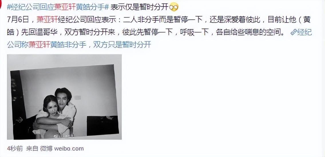 才渐渐平息了这场网络舆论,不过就当经纪人刚澄清两人没有分手的消息之后黄皓的发文更加让情节扑朔迷离了起来。