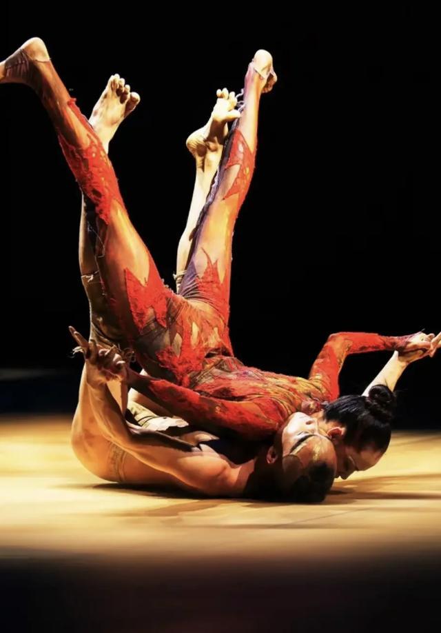 男舞者仰面躺在舞台上,女舞者与其面贴面,两人脖颈相交,十指紧扣。
