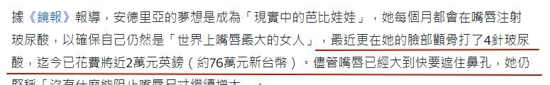 《芭比》电影大火后,有媒体采访了她。据报道,她每个月都会在嘴唇注射玻尿酸,以确保自己仍然是"世界上嘴唇最大的女人"。除了嘴唇,最近她脸部颧骨部分也打了4针玻尿酸。