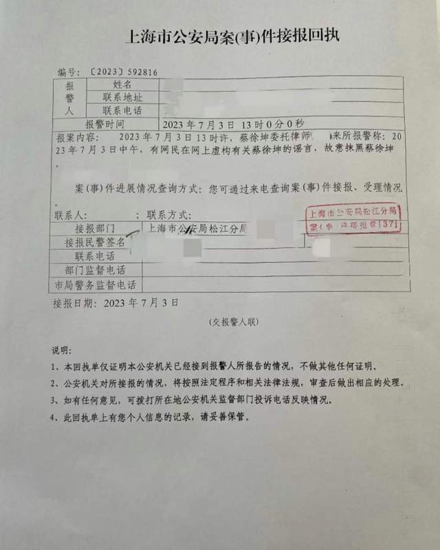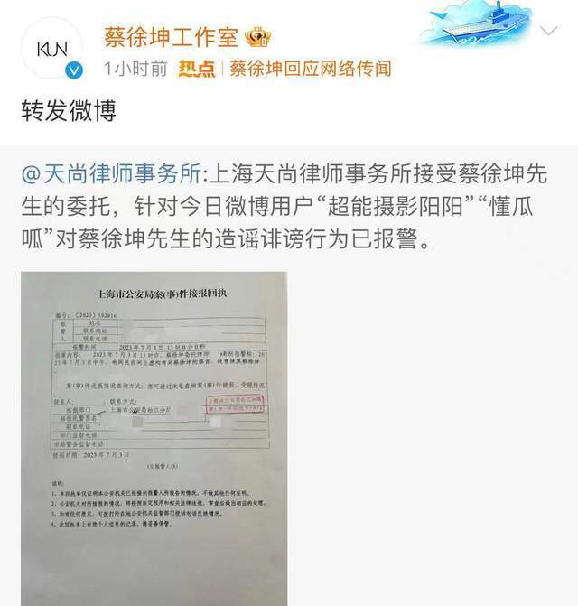 蔡徐坤工作室晒出的报案回执中写道"上海天尚律师事务所接受蔡徐坤先生的委托,针对今日"超能摄影阳阳""懂瓜呱"对蔡徐坤先生的造谣诽谤行为已报警。"