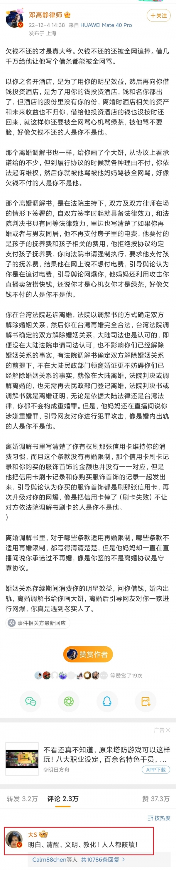 邓高静律师发文中的五点内容引发网友热议,鲜少发声的大S也进行了点评,她留言写道:"明白、清醒、文明、教化,人人都该读!"对此,您怎么看?