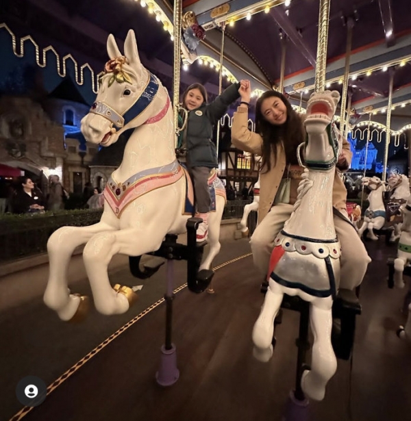 秦舒培和女儿一起坐旋转木马,手牵着手画面有爱,想必镜头后的老父亲陈冠希也露出了慈爱的笑容。