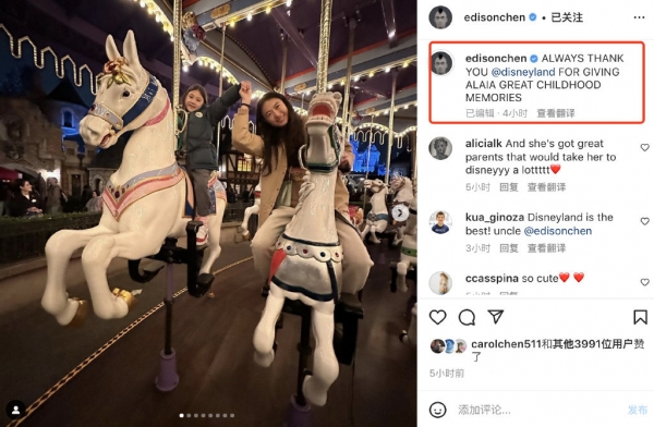 12月6日凌晨,陈冠希在社交平台上分享了陪伴妻子女儿一起度假的画面,一家人是迪士尼乐园的常客,他发文感谢乐园给女儿的童年创造了这么多的美好回忆。