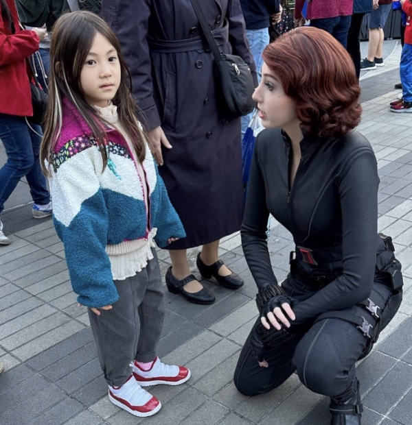 Alaia小小年纪就很时尚,头发还做了染挑,几束白色的发丝十分抢镜。小公主肌肤白皙,软软糯糯的很是可爱。蹲在Alaia身边的是漫威里的娜塔莎黑寡妇,当然这只是工作人员扮演的,Alaia经常和迪士尼乐园里的动漫人物互动,童年确实相当丰富多彩。
