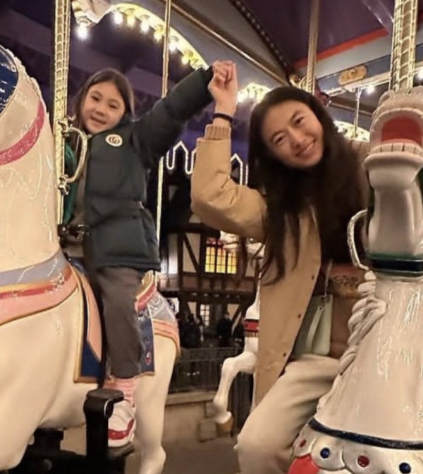 Alaia和妈妈一样,披散着中分长发,母女俩简直就是一个模子刻出来的,相似度极高。