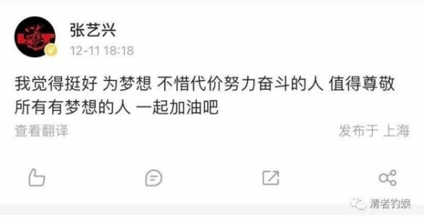 此后张艺兴疑似回应田曦薇:"我觉得挺好,为梦想,不惜代价努力奋斗的人值得尊敬,所有有梦想的人,一起加油吧。"