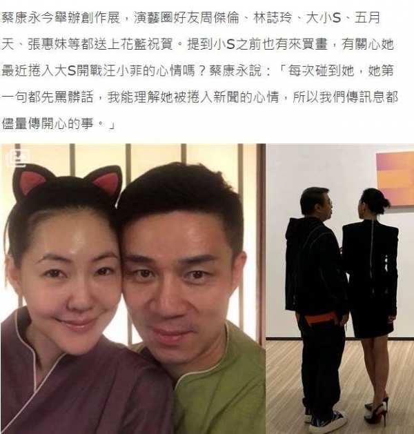 蔡康永本月举办作品展,包括周杰伦、林志玲、大S、小S等人送花,在谈及小S卷入大S汪小菲风波时表示:"每次碰到她,她第一句都先骂脏话,我能理解她被卷入新闻的心情,所以我们传讯息都尽量传开心的事。"