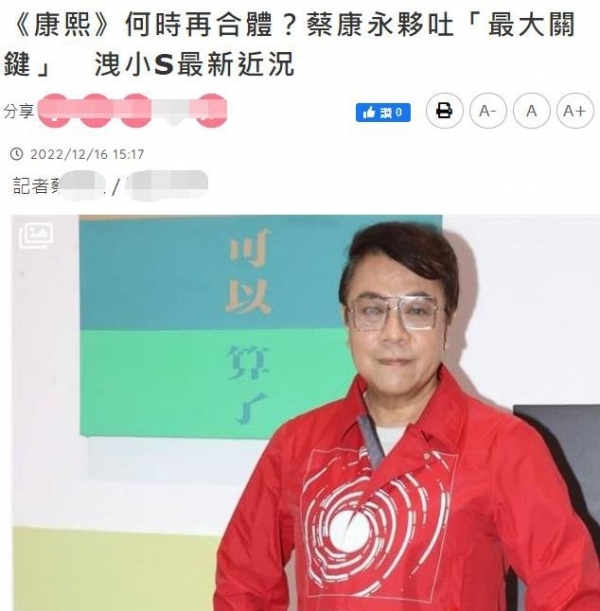 此前,小S曾公开与蔡康永的合照,让人猜测二人将回归《康熙来了》。