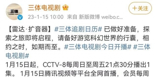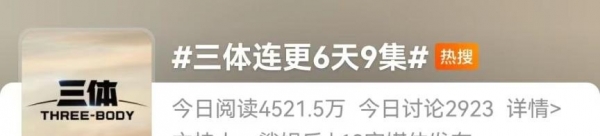在微博平台上,《三体》也掀起多个热议话题,包括"三体连更6天9集""三体电视剧今日开播""王子文叶文洁造型"在内的话题均登上微博文娱热搜榜,截至北京商报记者发稿时,多个话题的累计阅读量已实现破亿。