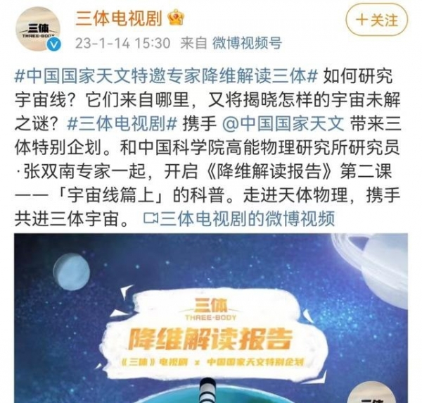 据《三体》官方微博,该剧与《中国国家天文》杂志进行的特别企划,邀请中国科学院多位专家一起推出的《降维解读报告》已正式上线,并对《三体》及宇宙相关知识进行解读,这吸引了不少粉丝、天文爱好者等不同人群。对《三体》感兴趣但并未阅读过小说的闫静表示,在《降维解读报告》上线后便第一时间观看了更新内容,主要是自己对《三体》及天文知识了解较少,担心看剧集时无法跟上节奏,因此想在前期多下点功夫。