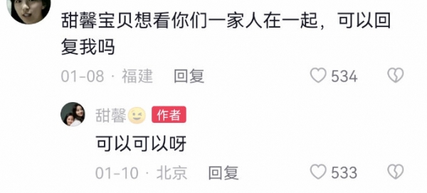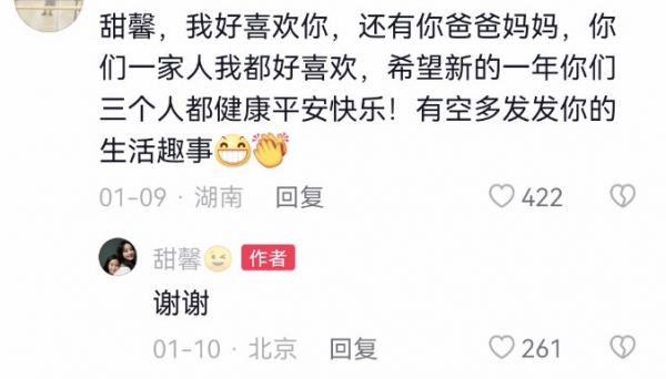评论区里提及一家三口的言论,甜馨也回复了不少。