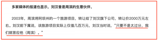 2001年,周滨在四川有一个旅游项目,因为开发难度过大,想要转让。刘汉得知这个消息后,自告奋勇花2000万买了下来。