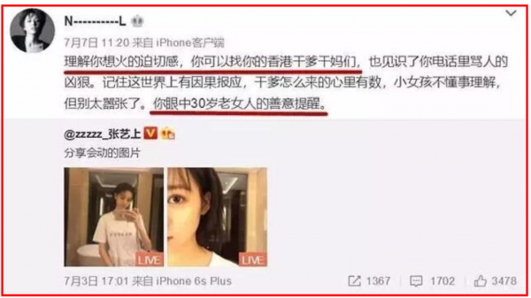 2018年7月,黄景瑜的"绯闻妻子"王雨馨的小号,发微博手撕张艺上。