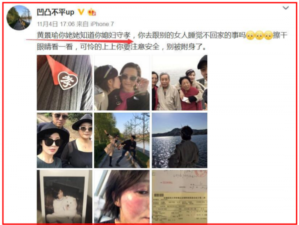 三个月后,一位名为"凹凸不平up"的网友,又爆黄景瑜"跟别的女人睡觉不回家"疑似家暴等猛料……