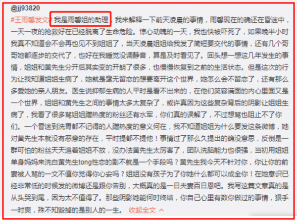 随后,一位自称王雨馨助理的网友,声称王雨馨因为黄先生的事,长期遭遇水军网暴,抑郁自杀……