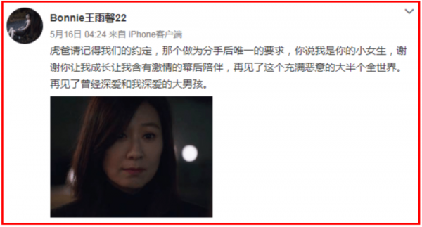 同年5月,王雨馨突然发文:"再见了曾经深爱和我深爱的大男孩"。