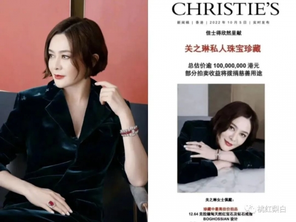 关之琳去年在佳士得拍卖珠宝,成交价高达3.4亿人民币,一时间缺钱提现的揣测都出来了,关之琳澄清说是为了庆祝自己六十大寿,并强调部分拍卖资金会用于慈善领域。