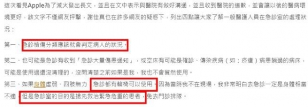 这位护理师也解释了为什么医院会有空病床但不让人躺的原因,可能是因为没来得及消毒处理或者为接待紧急病重患者以及大量伤患做预备,他认为相比较Apple想要的人情味,医院更应该提供专业医疗。