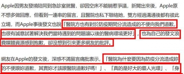 看到Apple声称医院已经跟她道歉,医师半信半疑,认为医院只是想到"息事宁人",不代表医护人员愿意道歉,希望Apple不要用"道歉"这件事证明自己是对的,最后这位医师强调,Apple本就应该现场沟通,不应该运用自己的明星话语权,借用媒体给医院施压。