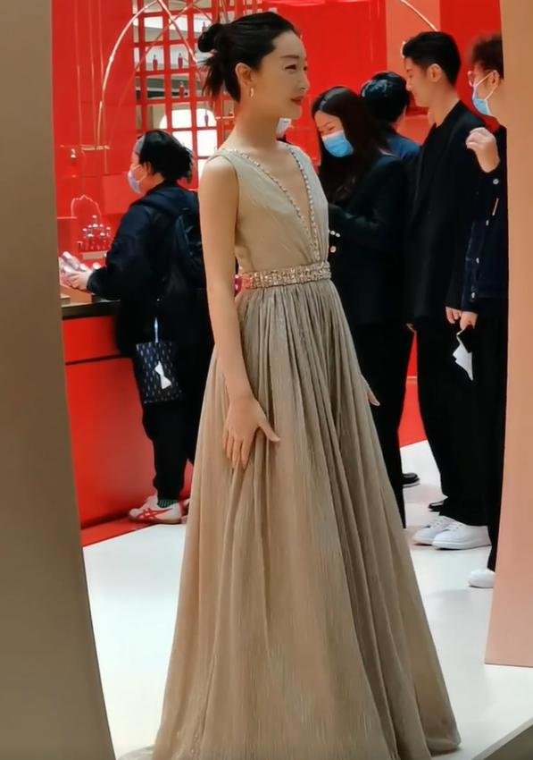 在一次线下活动中,她也穿上了深V长裙,再一次让大家意识到了她的身材到底有多么扁平。