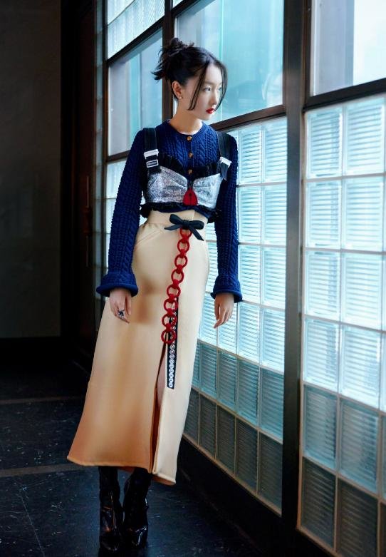 当然,周冬雨也不是没有过穿对了的时候,比如她参加活动时穿的这身,深蓝色针织毛衣搭配开衩半裙,相比于布料少,她更适合有设计感、剪裁复杂的衣服。