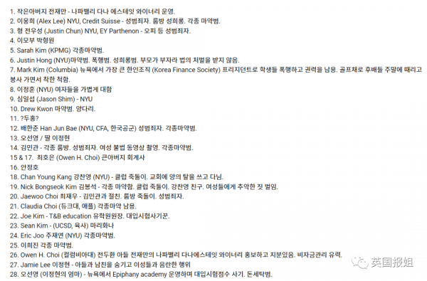 除了把家里人爆了个底儿掉之外,全宇元还抖落出了自己在纽约大学的校友、纽约金融业工作认识的熟人等各种韩国朋友,把他们犯下的罪都爆了一遍。