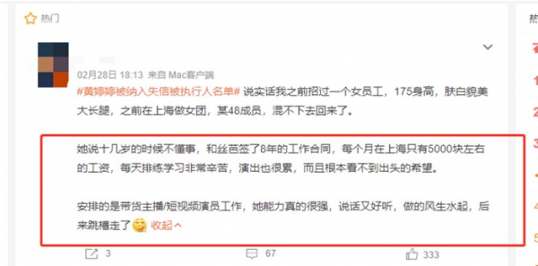还有网友在社交平台爆料,曾经有在丝芭混不下去的小艺人转行找工作,称自己十几岁的时候就和公司签下8年合约,每个月的收入只有5000块,排练学习非常累,但又看不到未来。