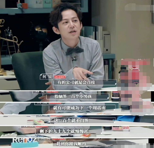 何炅就曾在节目中揭露娱乐圈经纪公司内幕,他称:"现在的经纪公司会大量签约新人,一签就是100多个,而且时间很长,有的长达十年。只要有1个火了,那么这100个新人都没有白签。至于剩下的99个,公司就慢慢和他们耗,想要解约,那就交违约金。无论如何,经纪公司都不会赔钱。" 他称经纪公司最后赚的就是解约的钱,解约金最低一个人约50万。
