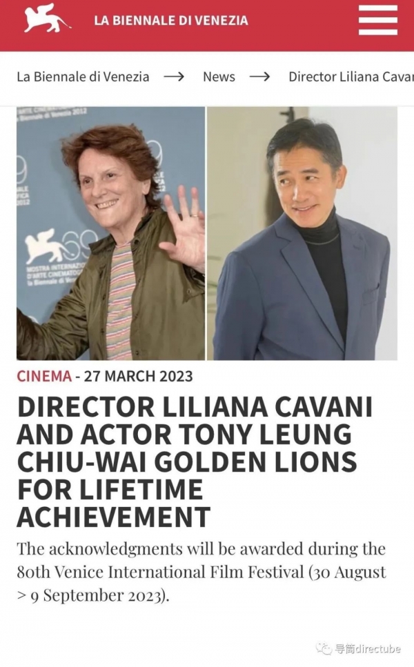 第80届威尼斯国际电影节将为意大利导演莉莉安娜·卡瓦尼(LILIANA CAVANI)和中国香港演员梁朝伟颁发终生成就金狮奖。第80届威尼斯国际电影节将于2023 年 8 月30日至 9月9日进行,两位获奖者将亲赴现场领取金狮。