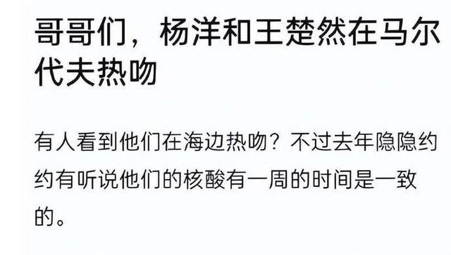 其实早在前几天,有网友就透露,她在马尔代夫偶遇到了杨洋和王楚然在海边热吻,王楚然曾晒出过自拍照,她的背影被扒出是海岛。