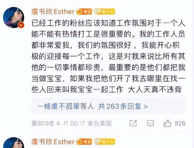 虞书欣不希望粉丝和工作室闹掰,她在评论区留言,表示工作室工作人员都很好,她希望爱她的人能够齐心协力。