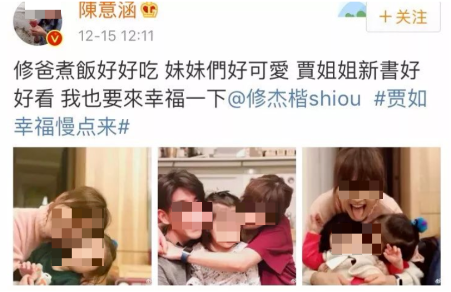 C位配图更是怎么看怎么不对劲:陈意涵双手环着满脸通红的修杰楷,以及贾静雯和修杰楷的女儿↓