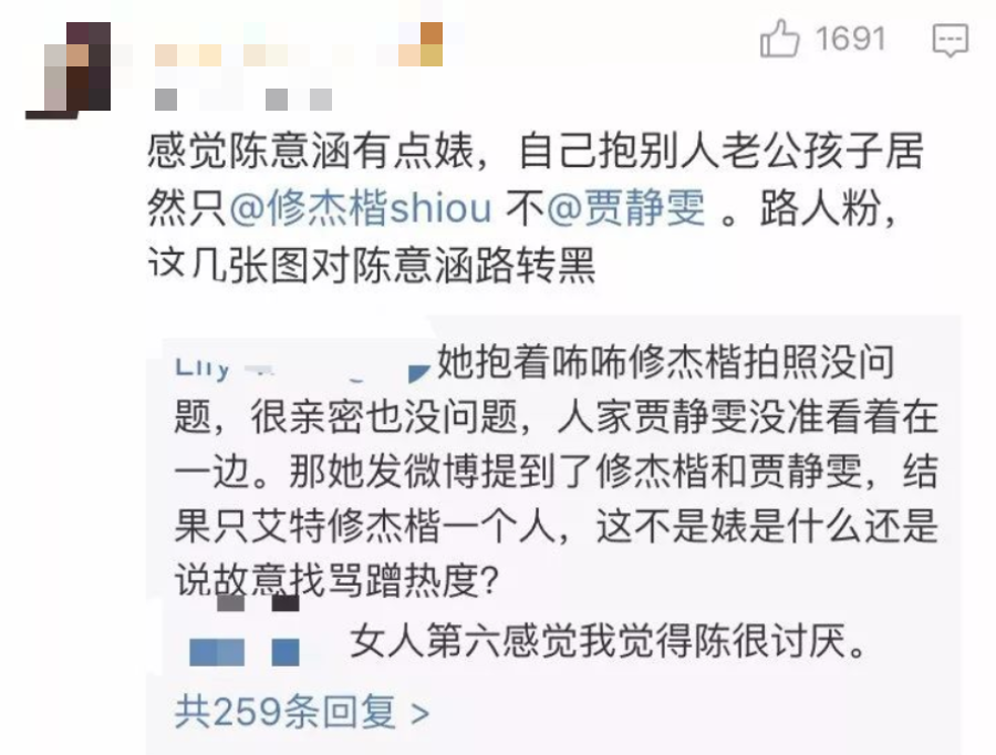 网友们对"父女情"的解释并不感冒,说陈意涵抱别人老公孩子拍照就算了,还不艾特贾静雯,就是不好。