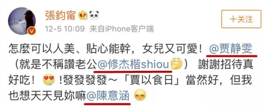 意思是张钧甯和陈意涵一起去贾静雯家里做客,结果陈意涵事后发wb只提张钧甯,不提贾静雯?