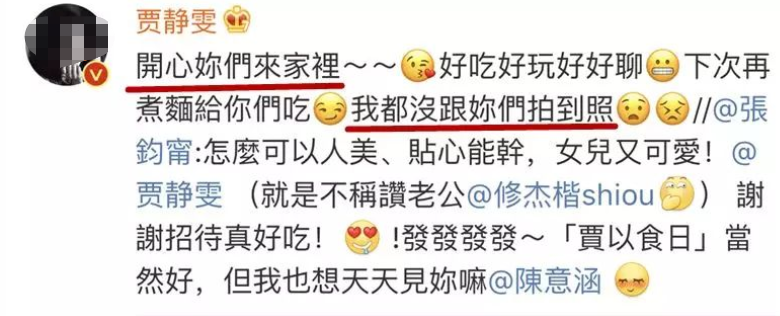 看文案大概是她去贾静雯修杰楷家里做客了,感觉不错,于是上网感慨一下。