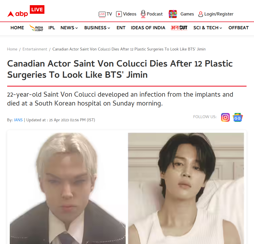 圣·冯·科鲁奇(Saint Von Colucci)的公关人员对媒体表示,由于整形手术导致的并发症,这名演员于23日早上在韩国一家医院去世。科鲁奇于2019年从加拿大移居韩国,在2022年进行了12次整形手术,希望可以在电视剧中与将要饰演的韩国男团成员更加相似,"科鲁奇对自己的西方容貌感到不安,而他在韩国找到一份工作也非常困难。"