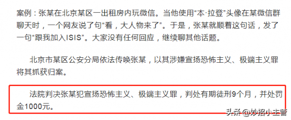 有一些人喧哗取宠,专门选择一些恐怖主义人员图片头像,说一些恐怖主义的说话,以加入某恐怖主义组织为荣等。很可能会因犯宣扬恐怖主义、极端主义罪,而被判刑,如一起签背景的张某。