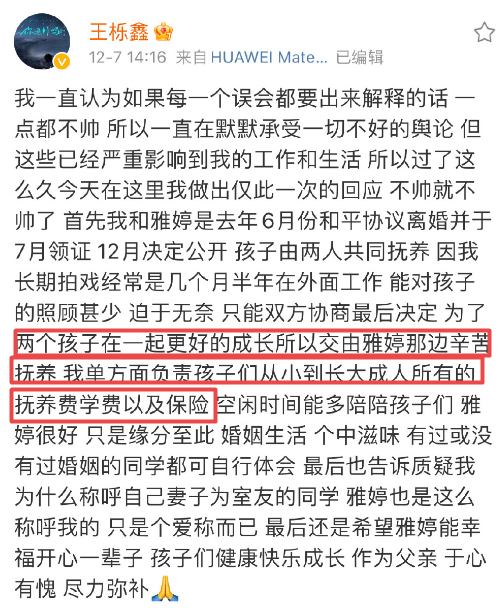 至于一双儿女,因为吴雅婷不想让姐弟两个分开影响他们之间的感情,而王栎鑫由于工作的关系经常在外拍戏,所以,经过协商后他们决定儿女都跟着妈妈吴雅婷生活,王栎鑫则单方面负责孩子们从小到长大成人所有的抚养费学费以及保险。虽说王栎鑫并未透露具体要支付给前妻多少费用,但外界却有传言称他每个月要给吴雅婷7位数抚养费。